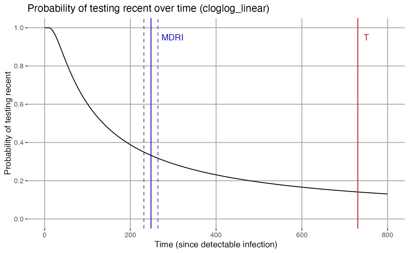 cloglog_linear: Fits a binomial regression to probability of testing recent with a log log link on log(t), where t is time since (detectable) infection.